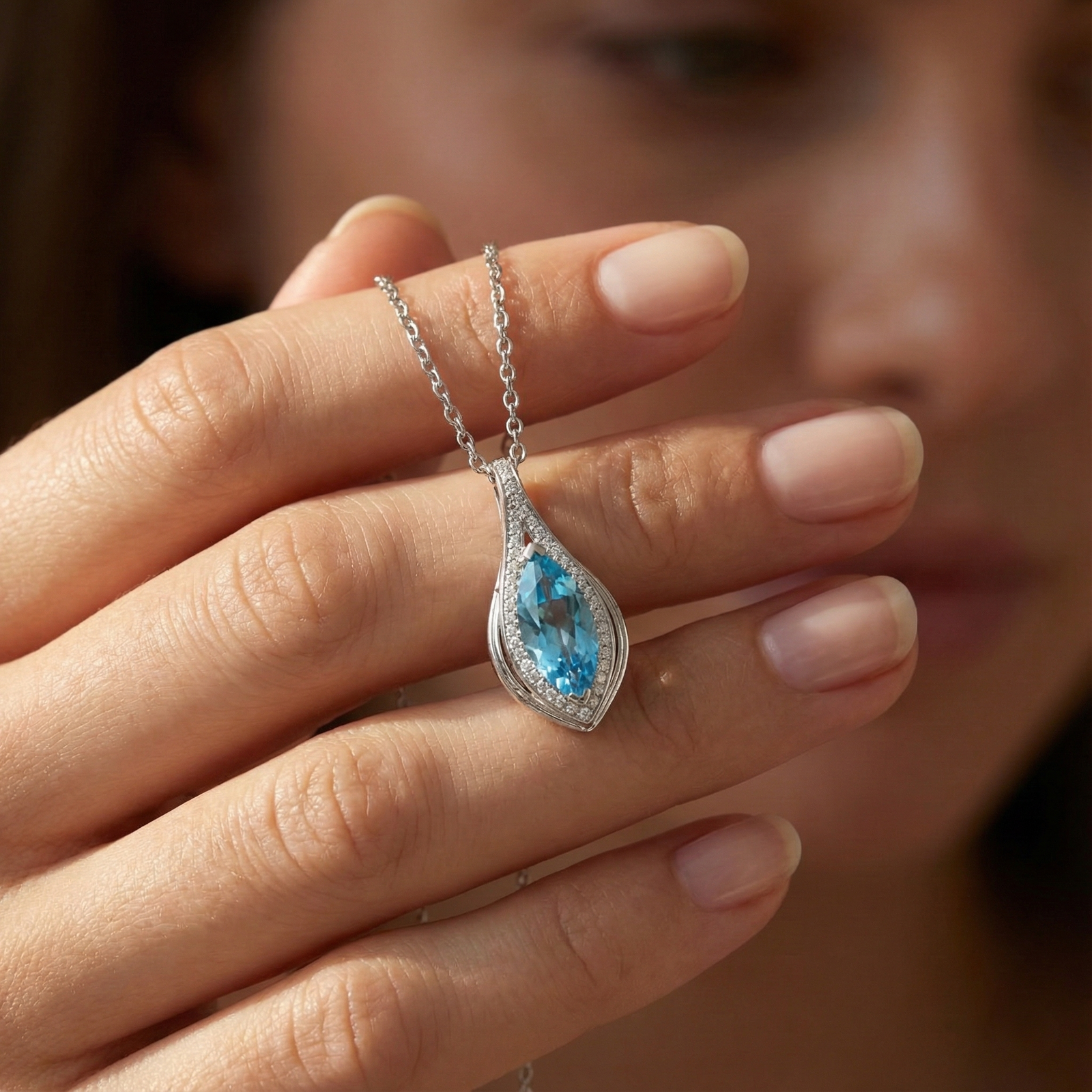 This blue topaz drop necklace showcases a beautifully cut gemstone in a flowing drop silhouette, creating a graceful and eye-catching appearance.