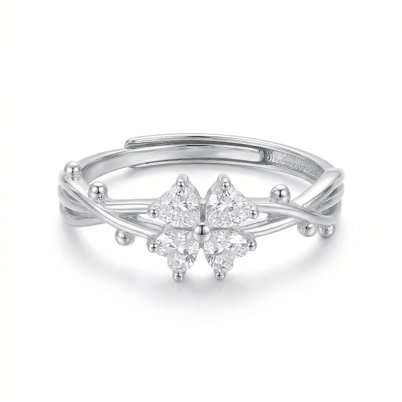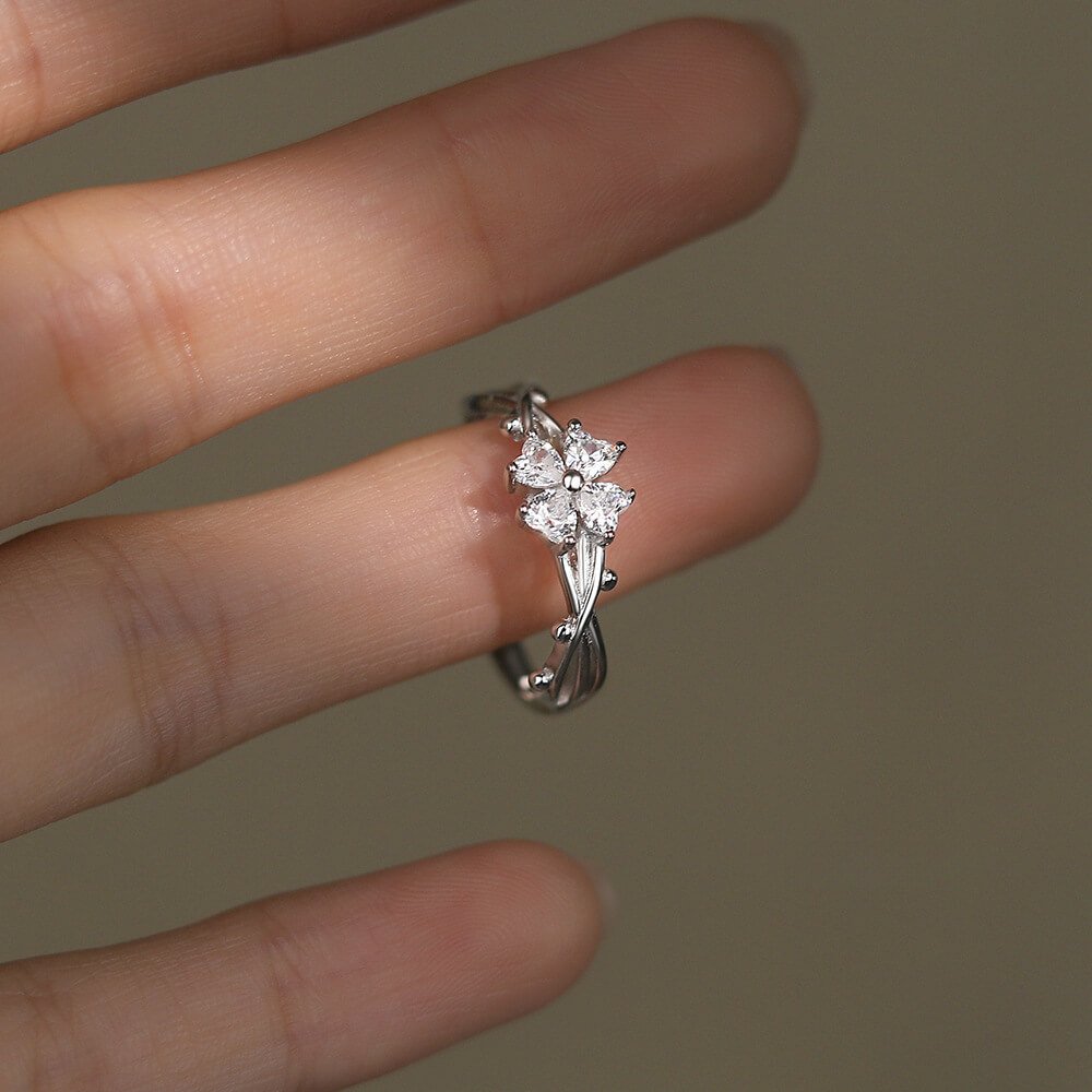 cubic zirconia four leaf clover ring, silver ring, adjustable ring