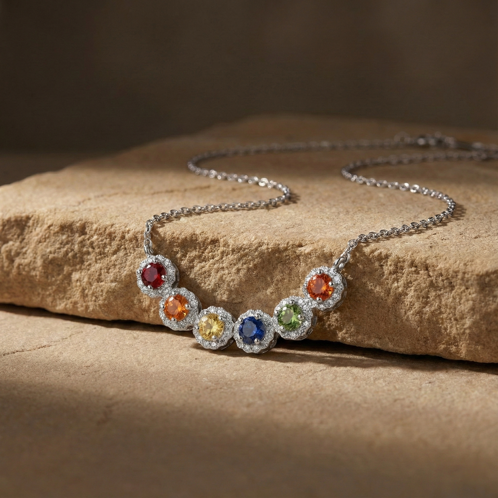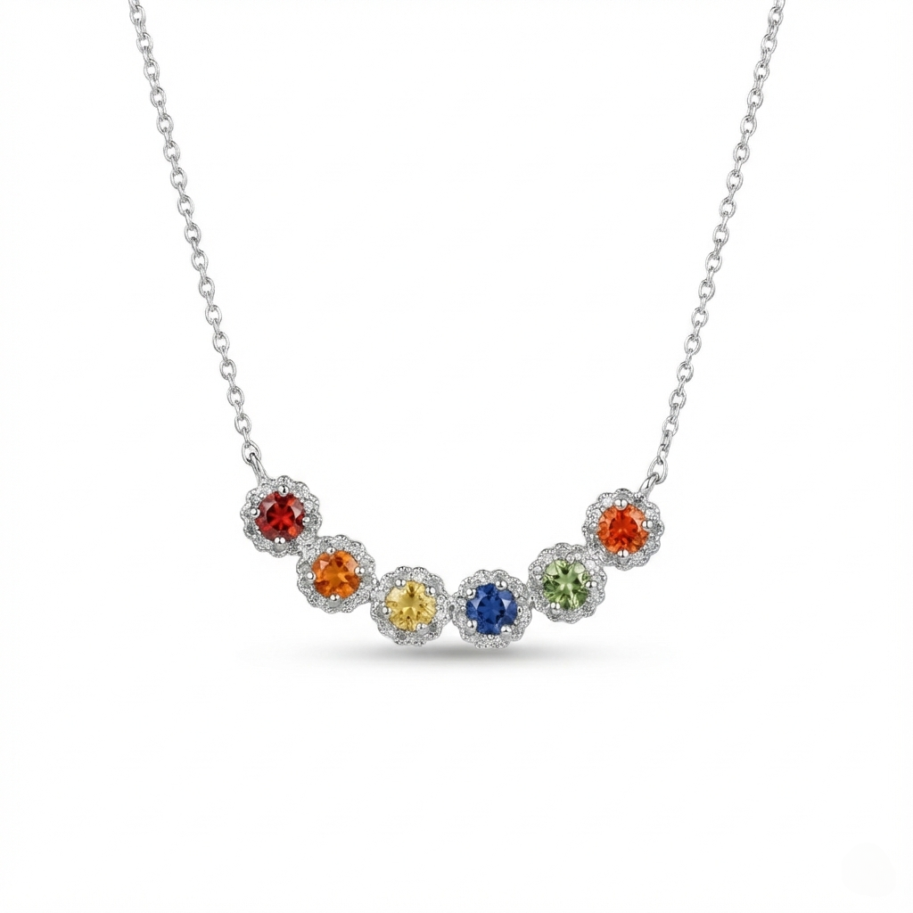 This multicolor gemstone necklace showcases six gemstones in complementary tones, creating visual harmony while maintaining a minimal, modern aesthetic. The polished sterling silver setting enhances the natural beauty of each stone and ensures comfortable, long-lasting wear.