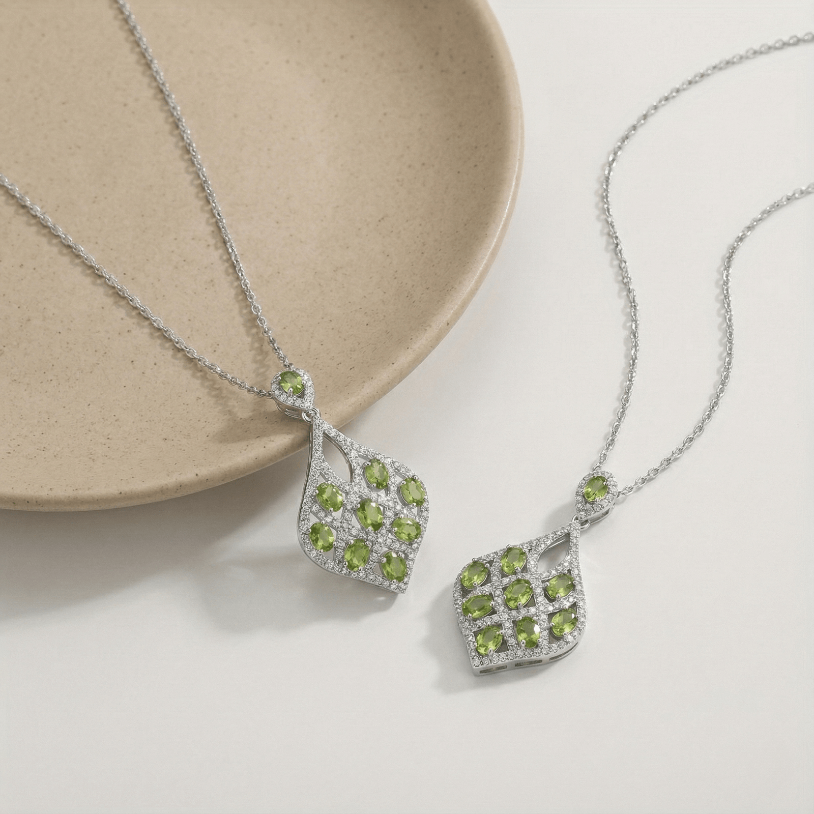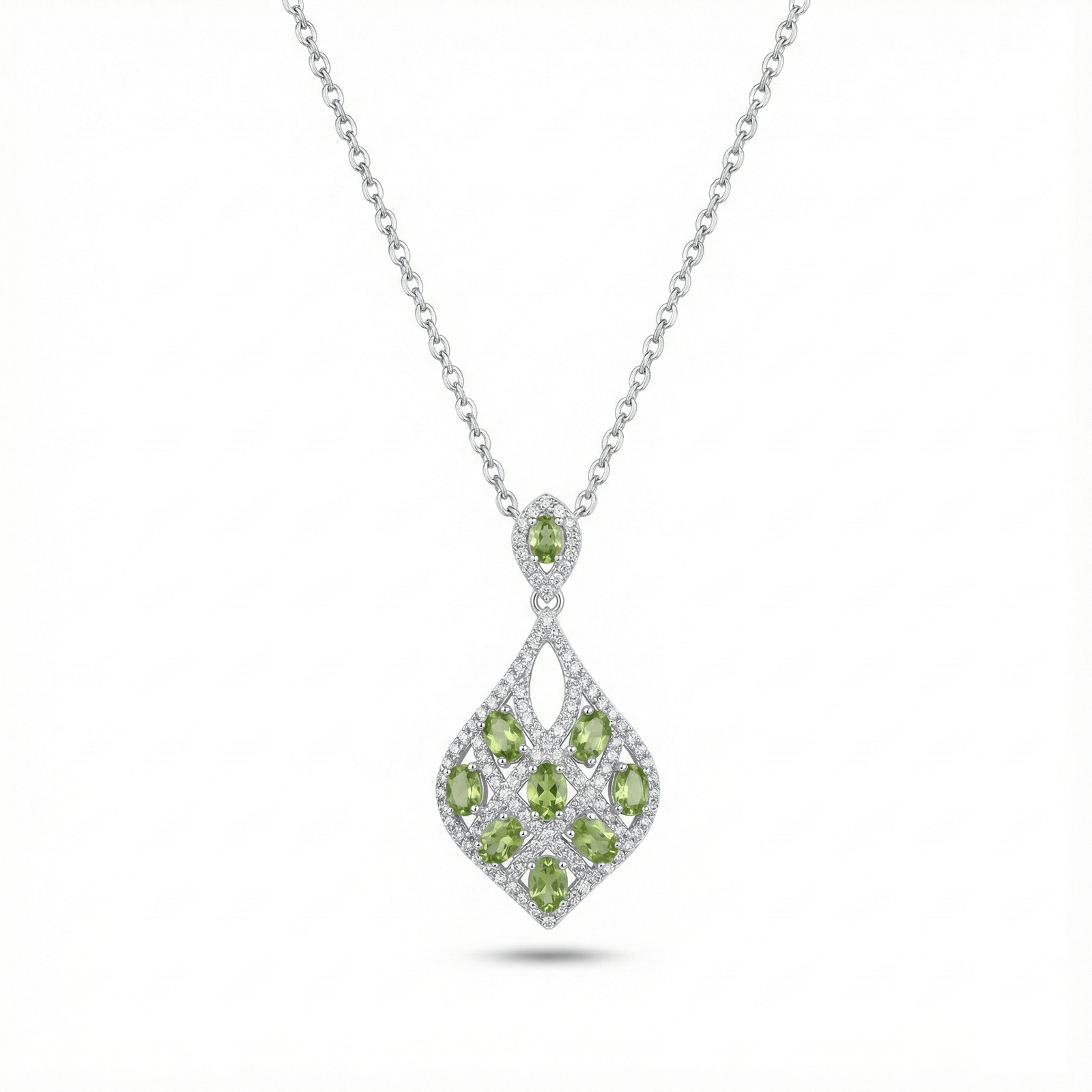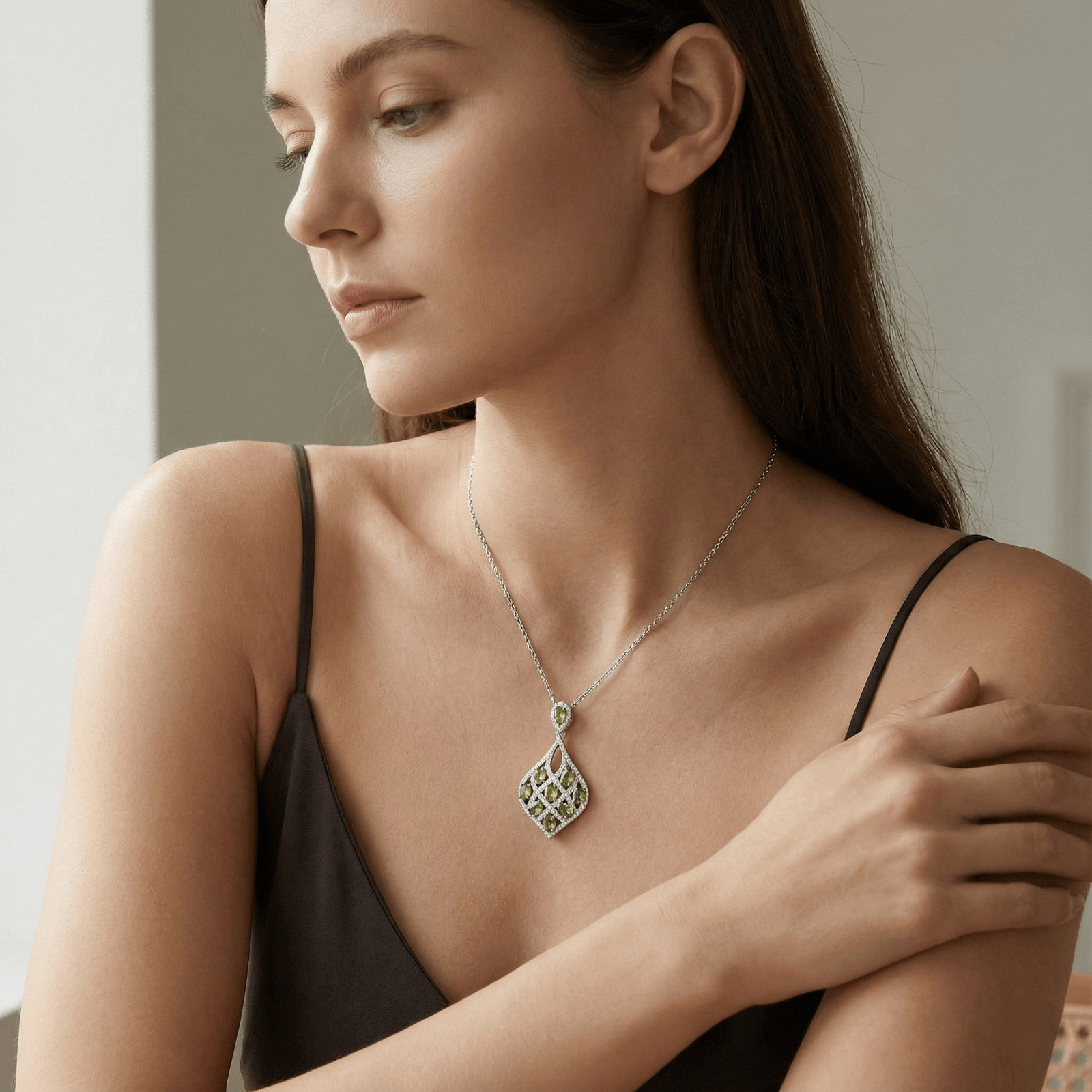 This peridot geometric drop necklace features an elegant openwork silhouette accented with natural peridot gemstones. The symmetrical lattice design creates visual depth while allowing light to enhance the vivid green tones of the stones, resulting in a refined yet expressive piece.