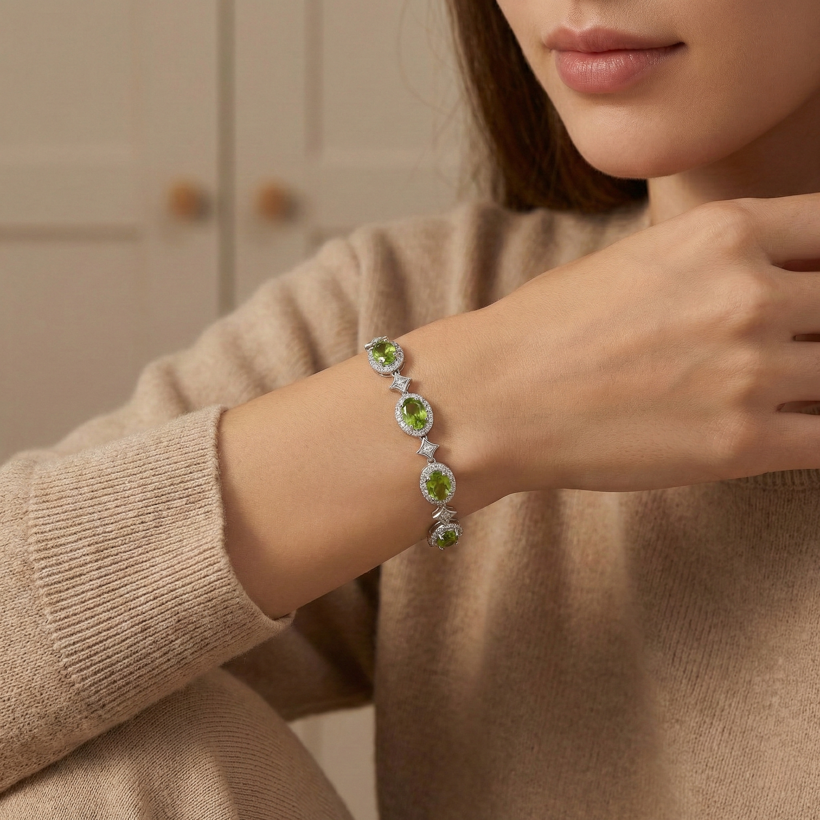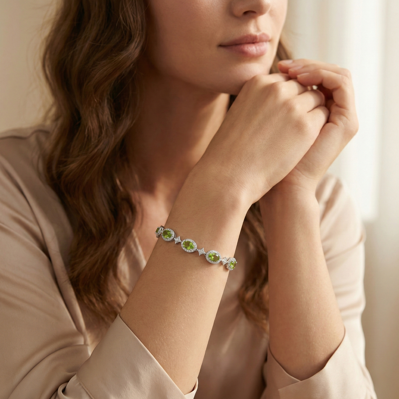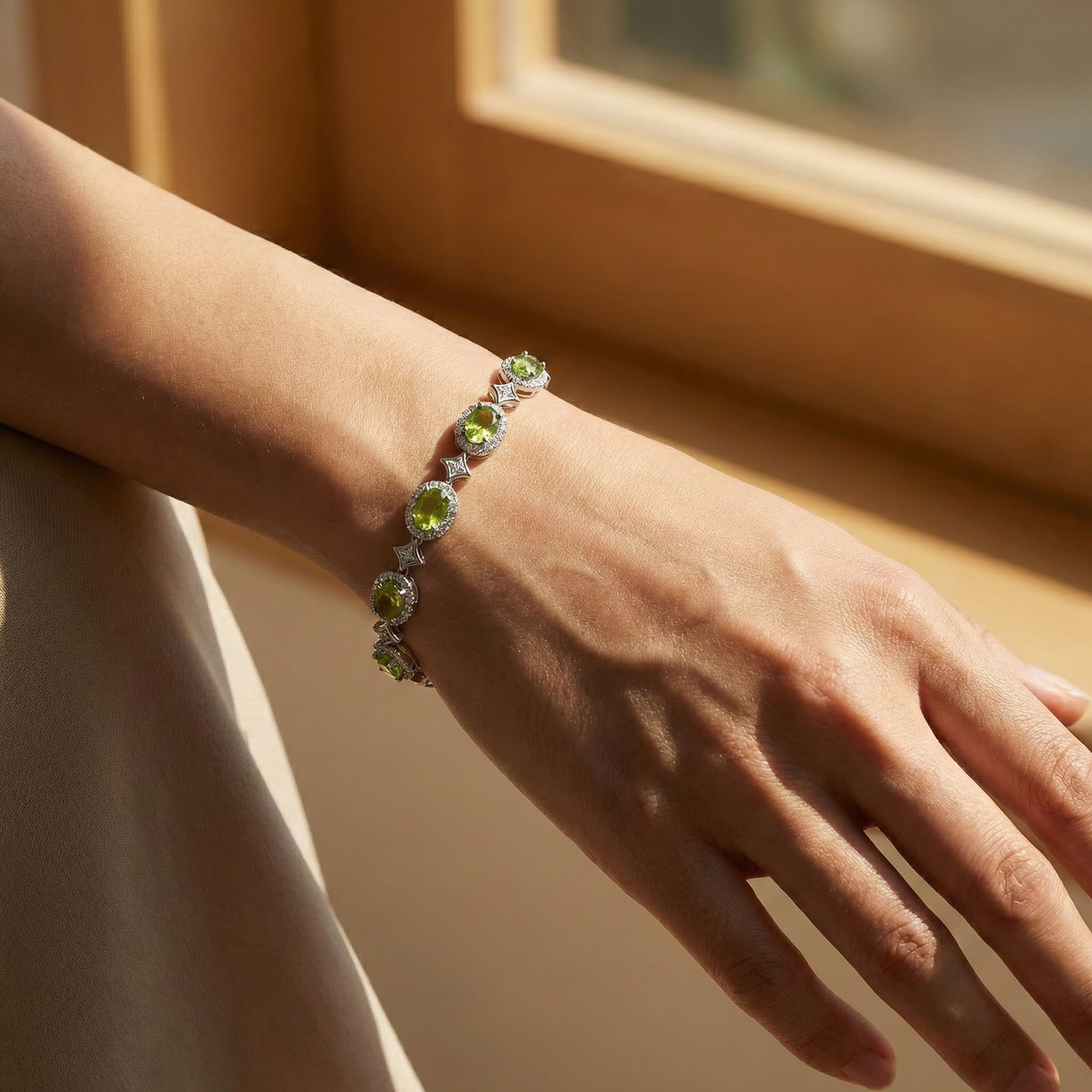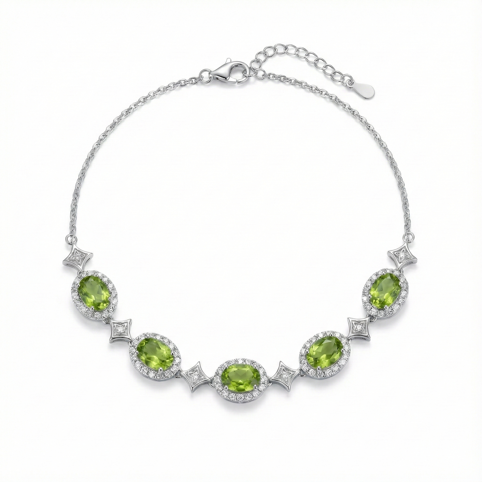 This Peridot Bracelet is crafted in S925 sterling silver and features natural oval-cut peridot gemstones framed with halo accents and star-inspired connectors, resulting in a refined and expressive silhouette. The vivid green tones of the gemstones create a clean contrast against polished silver, giving the bracelet a modern and minimal profile that pairs easily with different wardrobe color palettes.